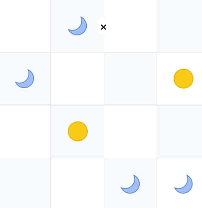 - Équilibre dans chaque ligne et colonne : Assurez-vous d’avoir un nombre égal de soleils et de lunes.